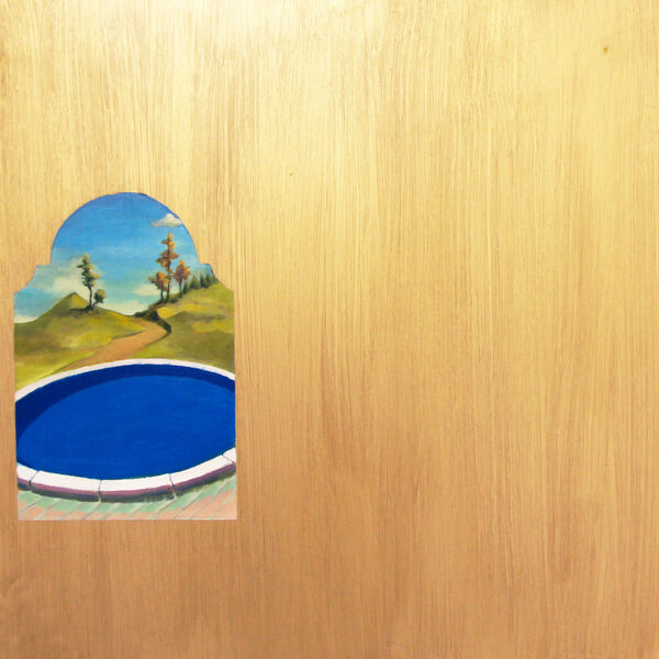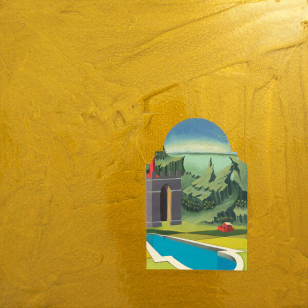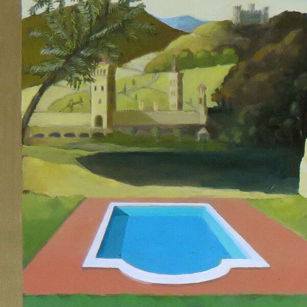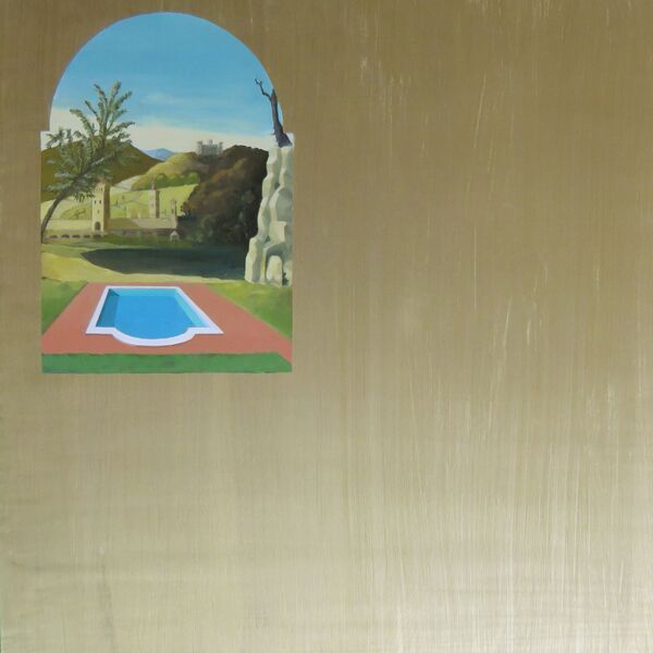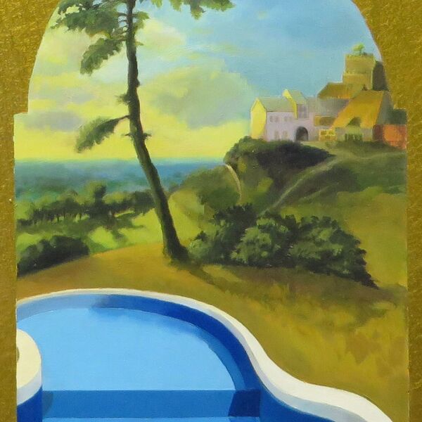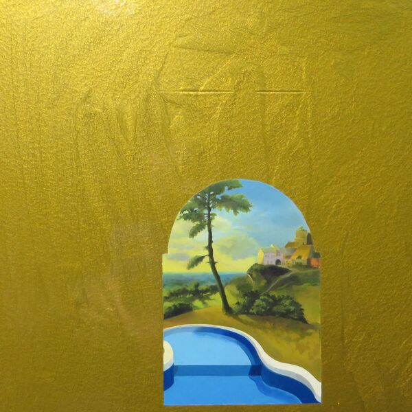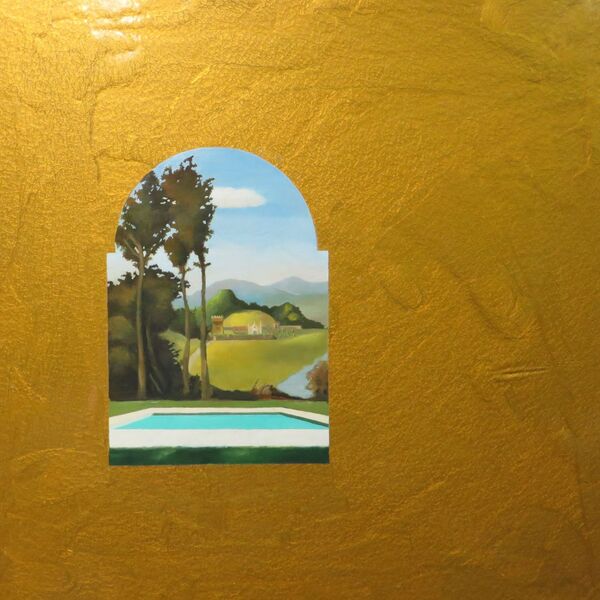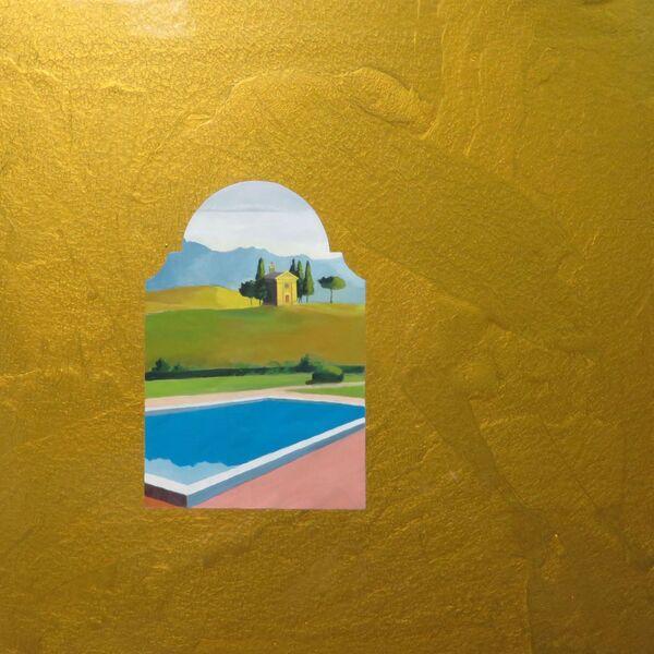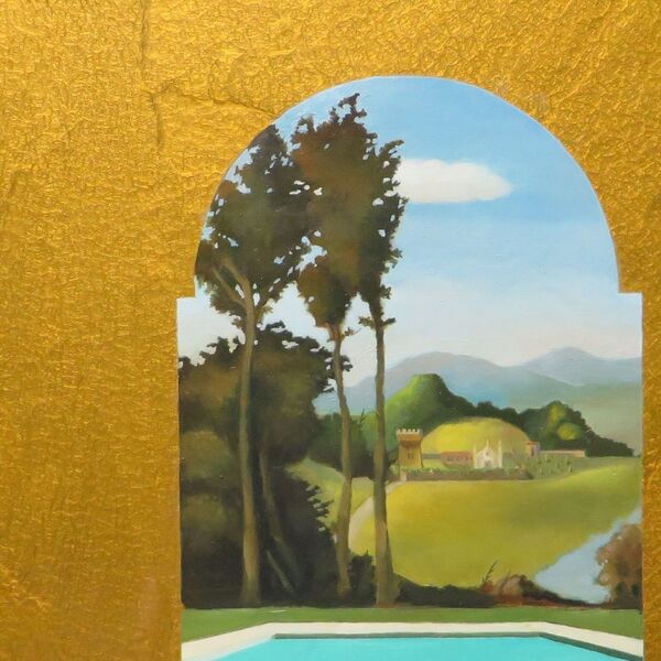 These paintings are a fusion of holiday brochure swimming pools and renaissance landscape paintings. They are all painted on gold supports, suggesting panels from altarpieces that might be seen on a Tuscan holiday.