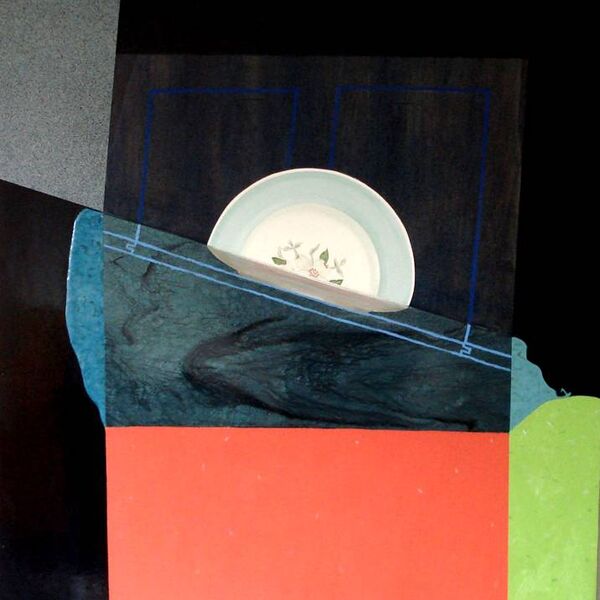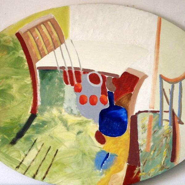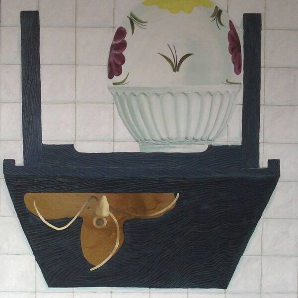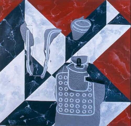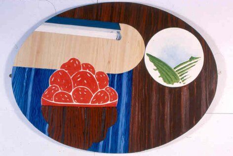 All representations are of course coded. The oval table-top paintings make an indirect reference to the ‘synthetic cubist’ still lives produced by Picasso and Braque 1911-1914. However the actual forms of representation, the depiction of actual objects and the handling of the paint makes further reference to a range of codes derived from commercial packaging, pop art and fine art sources. During this period I had a studio in Liverpool city centre and would often take tea breaks in a variety of cafés. As I sat thinking about my surroundings particular artists would come to mind and these are the references I would include in the manufacture of the paintings